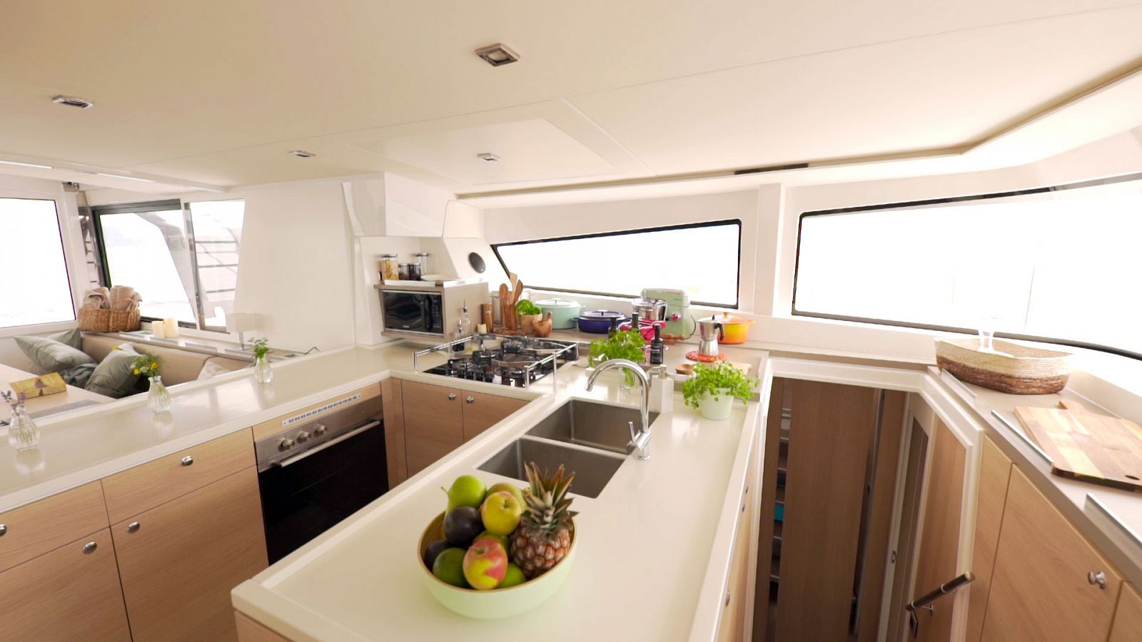 The fully-equipped galley includes cooker, sink and kitchen utensils. coffee maker and ice maker are also available.