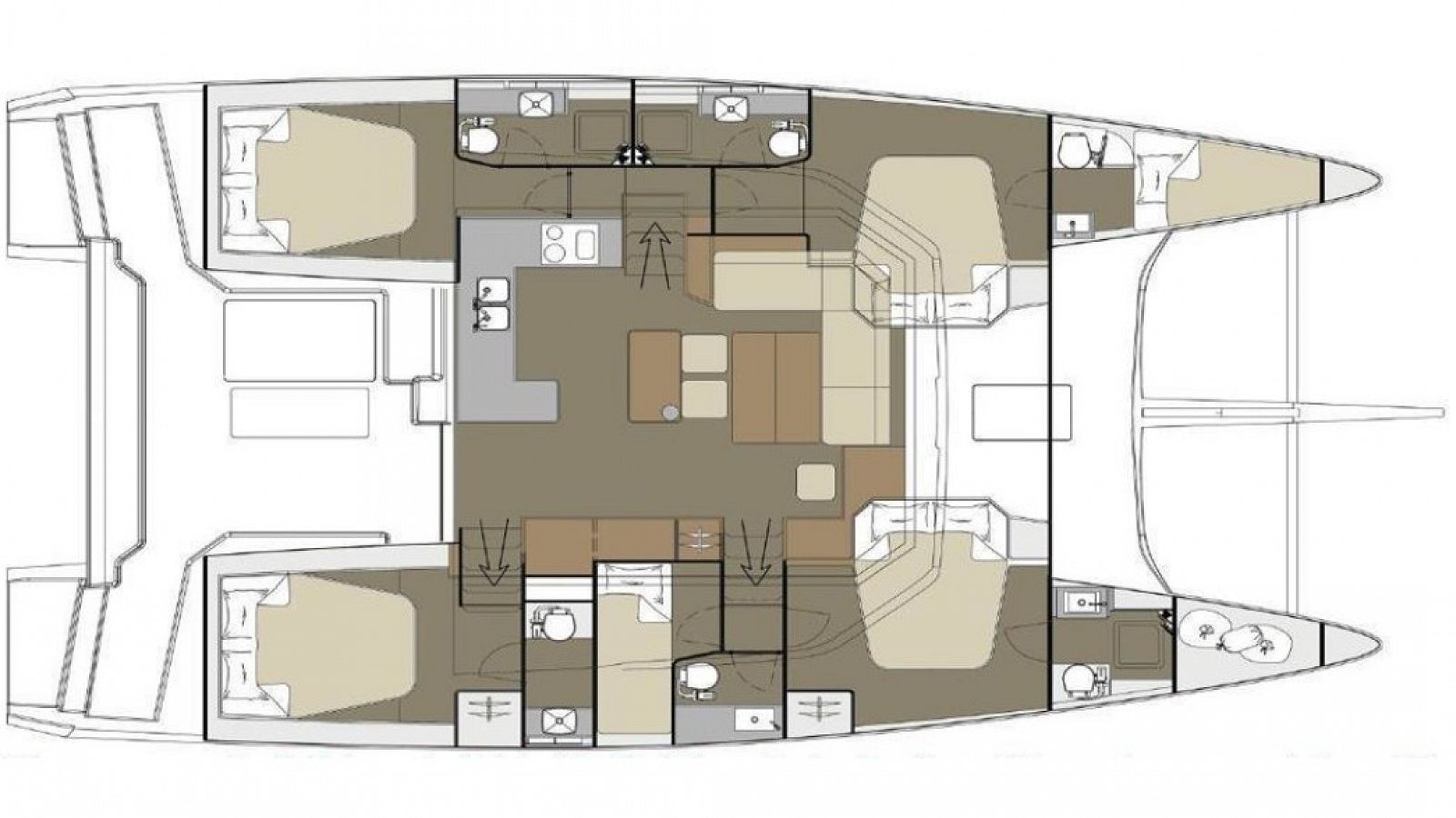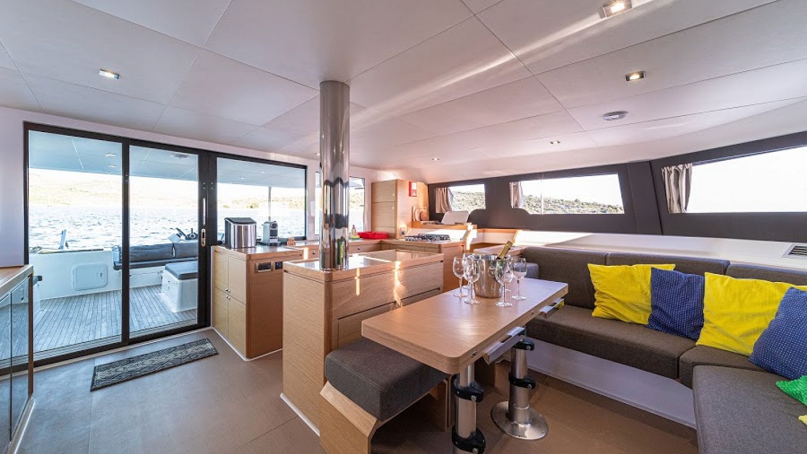 Pillows, blankets, and towels are included in the price. This catamaran is fitted with a classic mainsail and a self-tacking jib. It also has 2x60 hp motors and a 750 fuel tank, so sticking to your itenerary is a breeze even on those low-wind days.