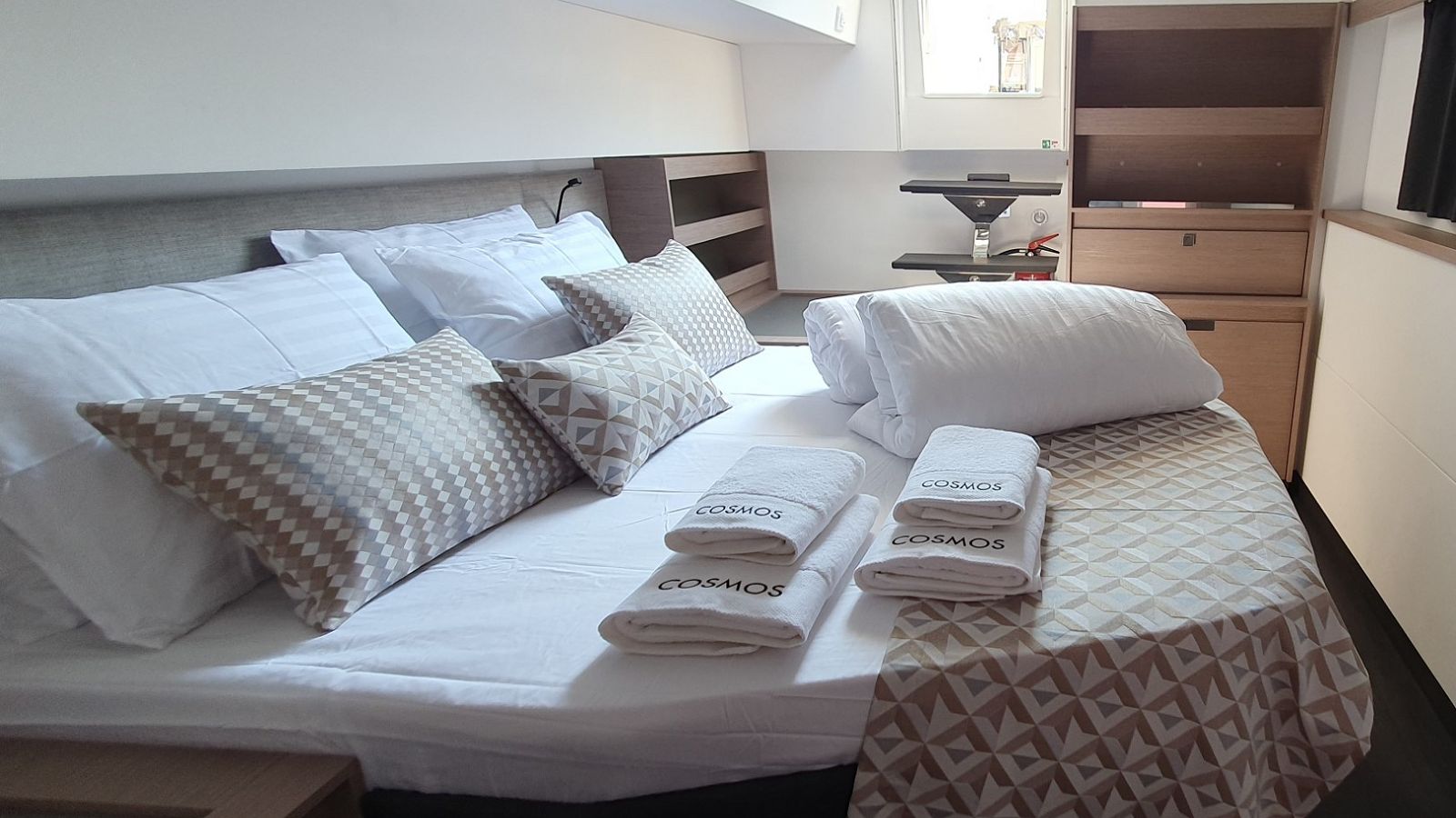Fountaine Pajot Aura 51 - COSMOS is a Catamaran built in 2023. She's docked in Marina Baotić, Croatia.COSMOS accommodates up to 11 guests in 6 cabins. You and your party will have 5 toilets with a shower at your disposal, so no long waits in the morning!
