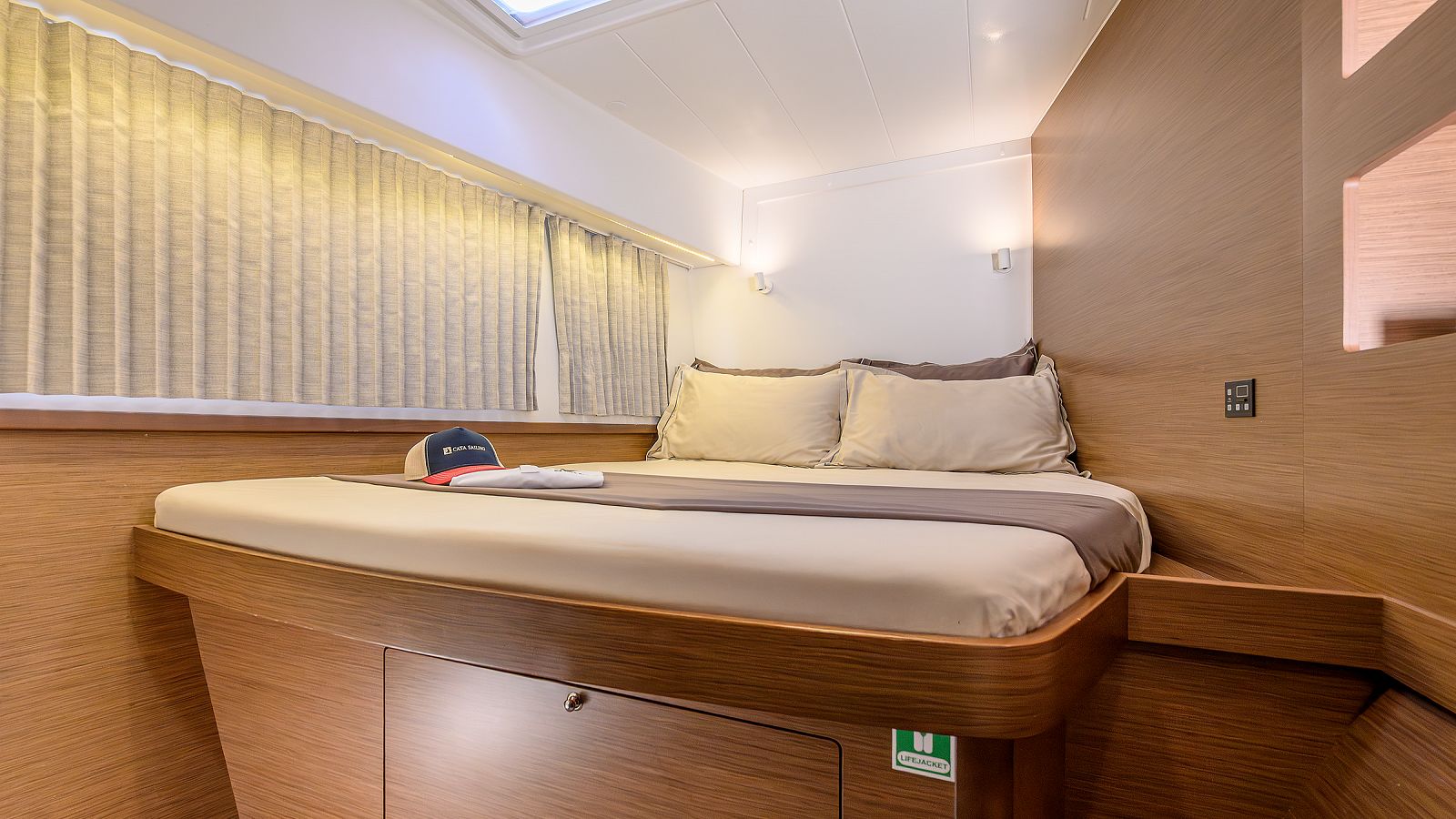 Pillows, blankets, and towels are included in the price. This catamaran is fitted with a classic mainsail and a self-tacking jib. It also has 2x57 hp motors and a 600 fuel tank, so sticking to your itenerary is a breeze even on those low-wind days.