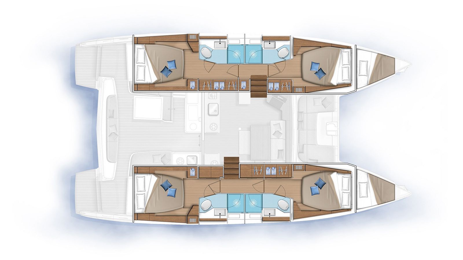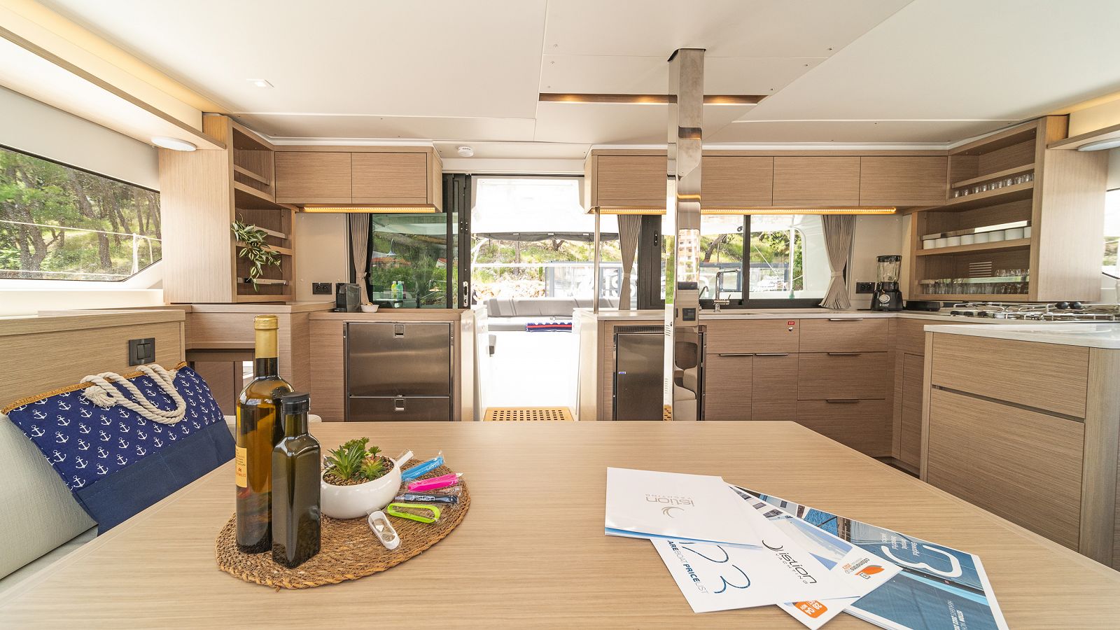 Pillows, blankets, and towels are included in the price. This catamaran is fitted with a classic mainsail and a self-tacking jib. It also has 2x45 HP motors and a 1040 fuel tank, so sticking to your itenerary is a breeze even on those low-wind days.