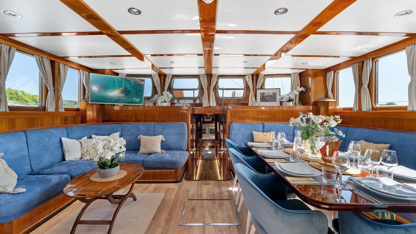 This gulet has a large outdoor dining area.