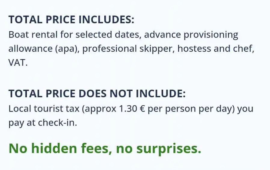 If you’re hiring any crew (skipper, hostess, cook), you’ll make payment arrangements with the charter company. In rare cases, we might charge your crew costs at booking and at charter’s request, but that’s not common practice and we’ll clearly state it on the boat page.