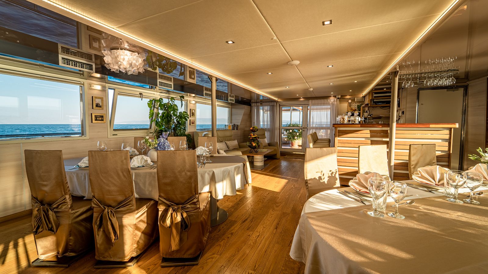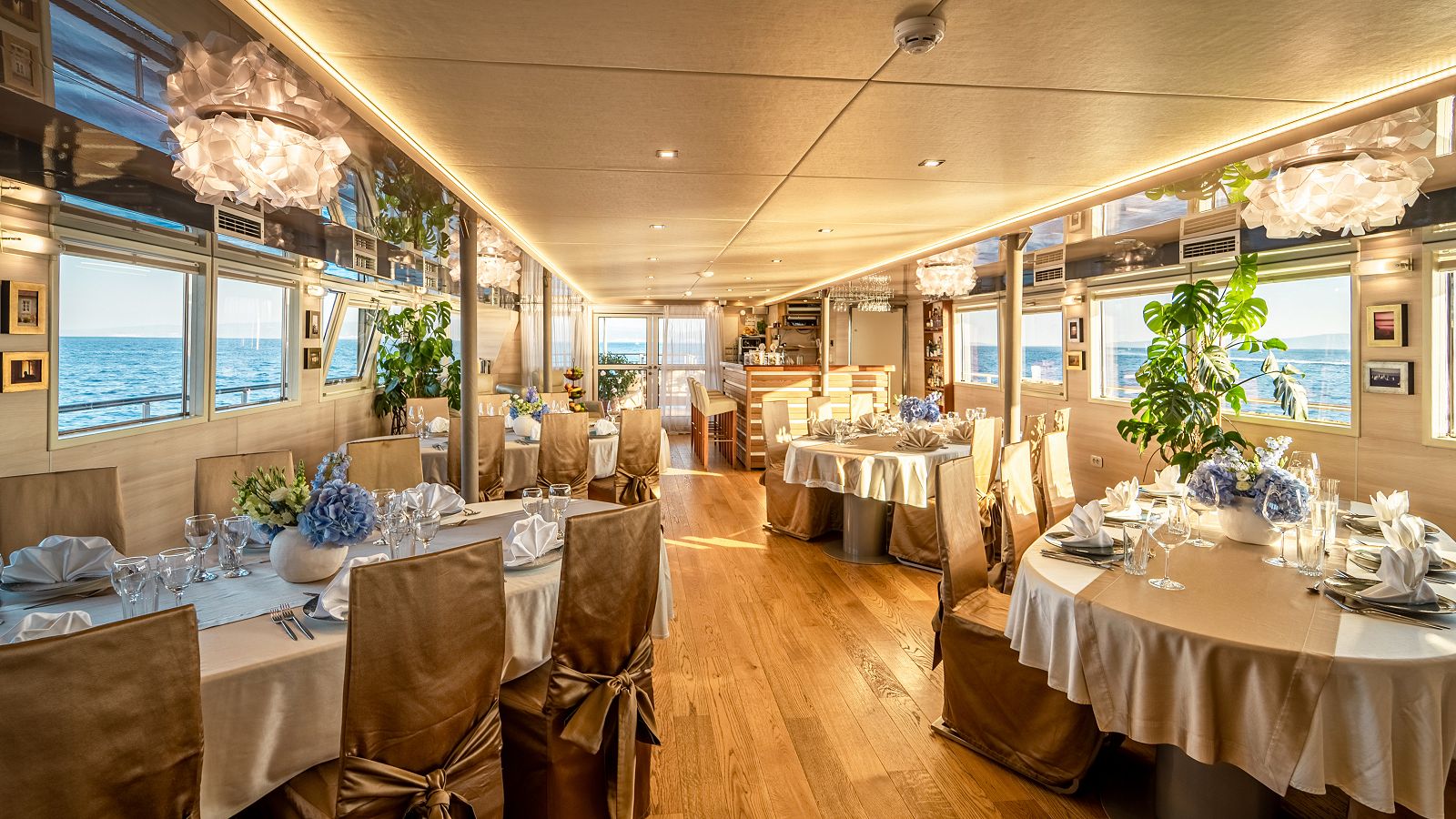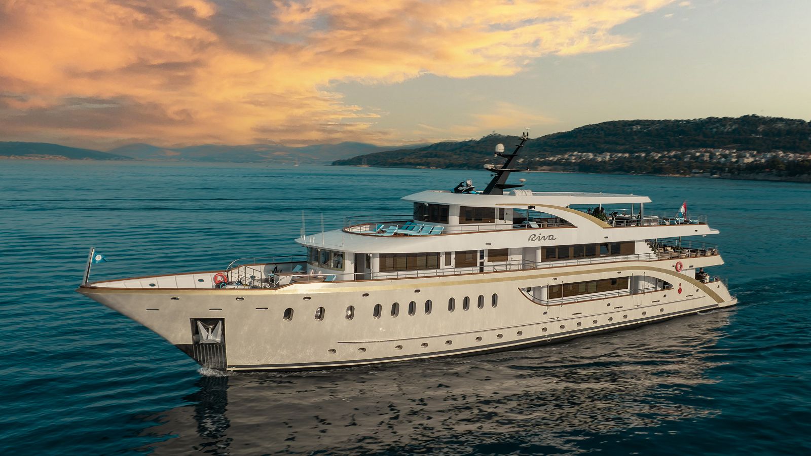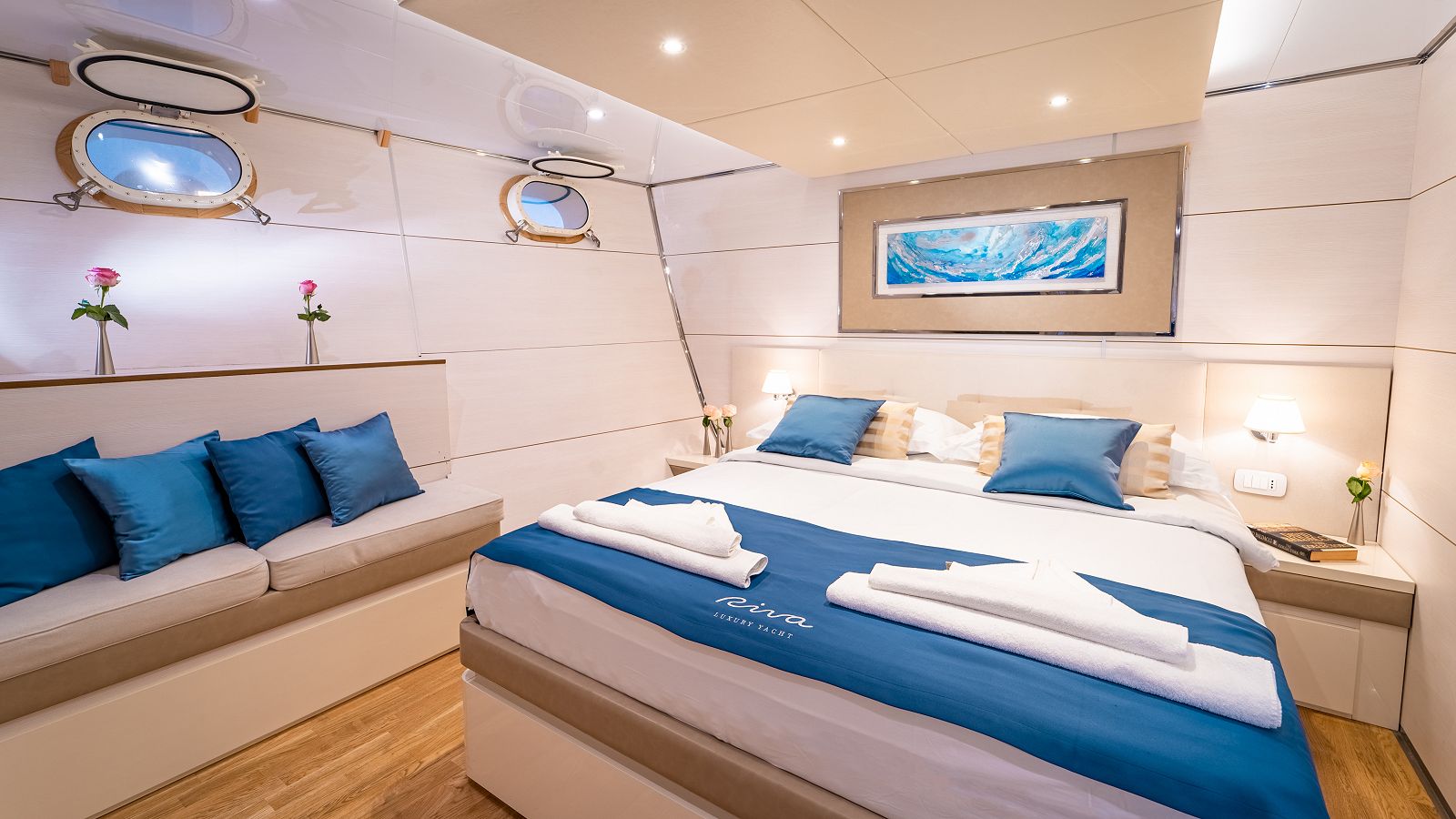 Riva accommodates up to 36 people. It has 18 cabins and 18 toilets.