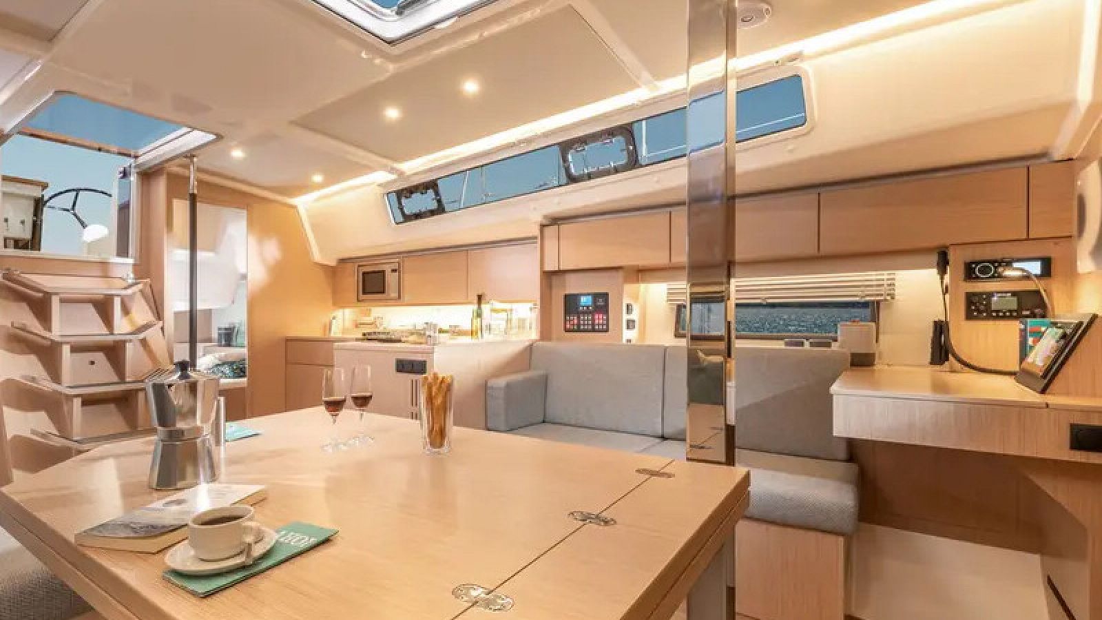 The Bavaria C42 represents a significant evolution in modern sailing yacht design. This 12.4-meter vessel showcases an innovative hull shape with a distinctive V-bow design, vertical stem, and broad stern, delivering exceptional performance and stability. The yacht's construction incorporates vacuum-infusion technology, ensuring a perfect balance between weight and rigidity. With its twin rudder system and sophisticated T-shaped keel, the C42 offers superior handling characteristics and excellent upwind performance. The deck layout features clean lines and intelligent design elements, including an integrated bowsprit for easy headsail handling and a self-tacking jib system that simplifies short-handed sailing.