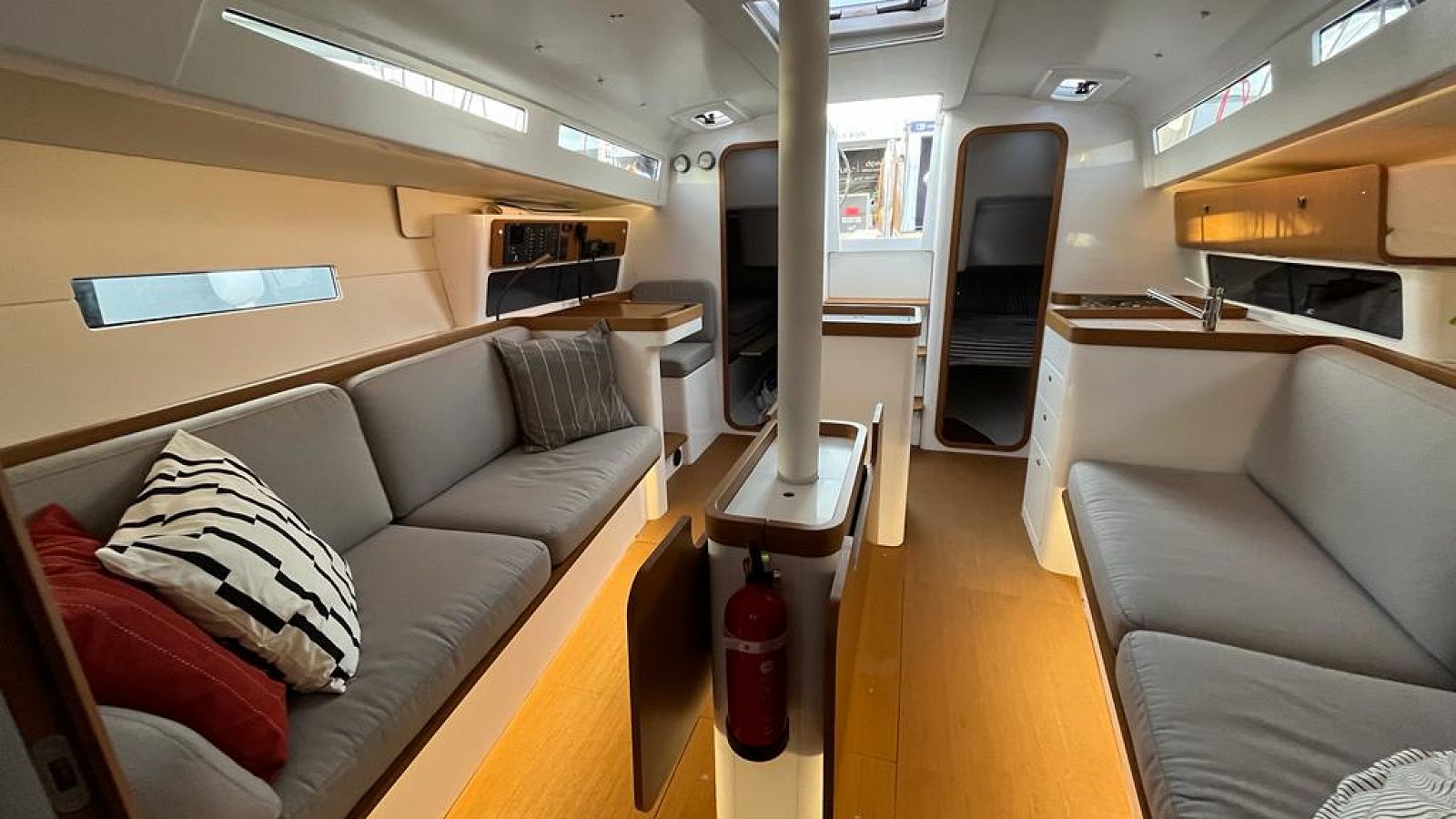 The ULTRA FIRST, a Beneteau First 36 from 2022, offers you a perfect blend of performance and comfort. With three cabins and one bathroom, this vessel comfortably accommodates up to six people. The boat's 21 HP Yanmar engine provides reliable auxiliary power, while the 2.3-meter draft ensures excellent upwind performance. The sailing setup includes a classic mainsail with a lazy-bag system and a furling genoa, making sail handling straightforward and efficient. The 3.8-meter beam creates a spacious cockpit and generous interior volume, perfect for both day sailing and extended cruising adventures. The modern navigation equipment and deck hardware are thoughtfully arranged for easy short-handed sailing.