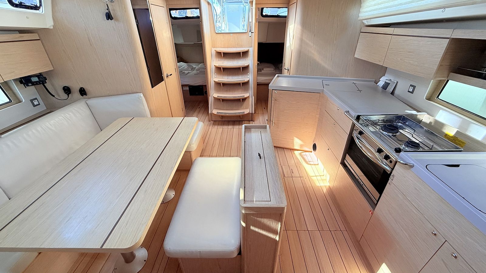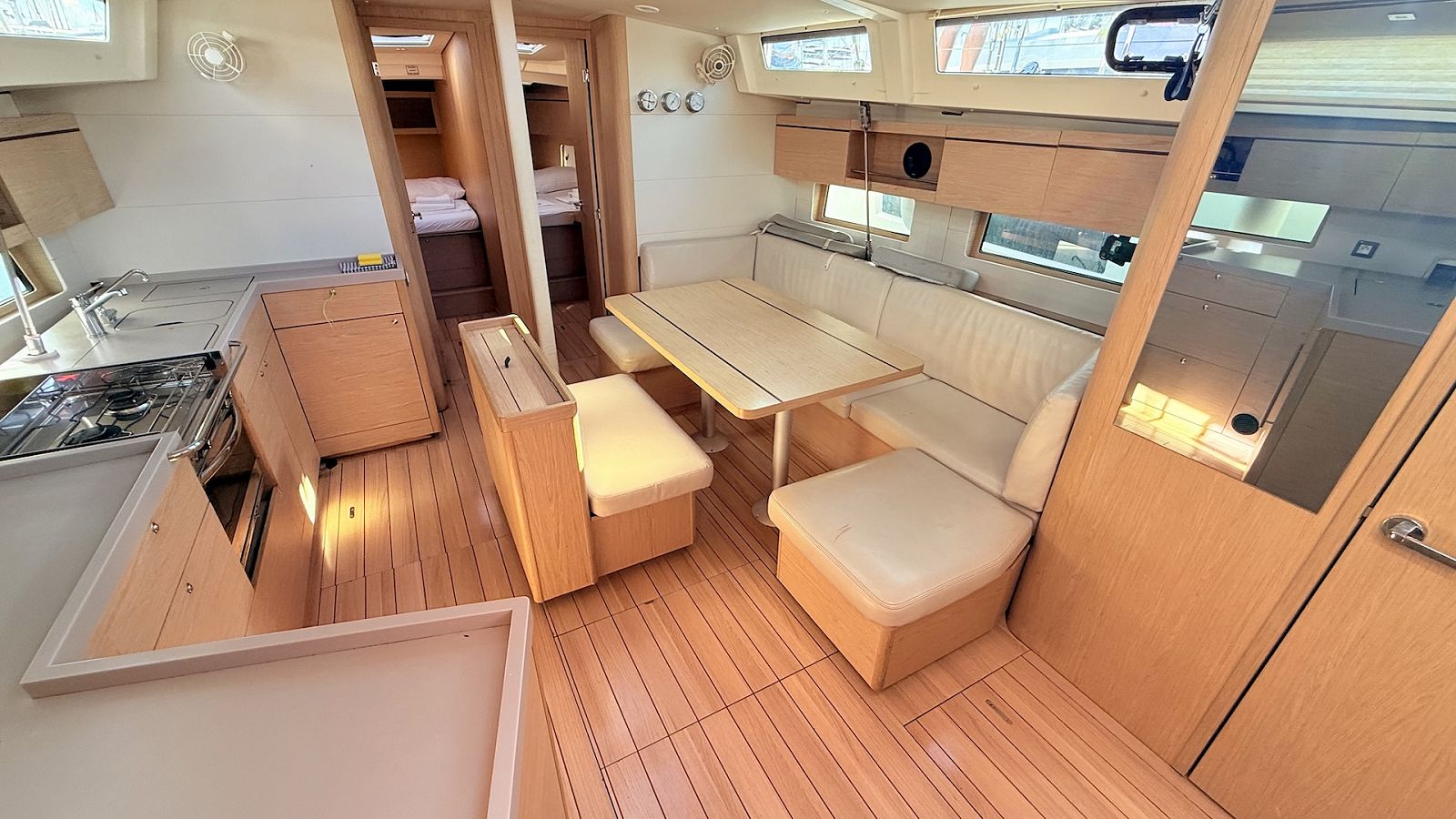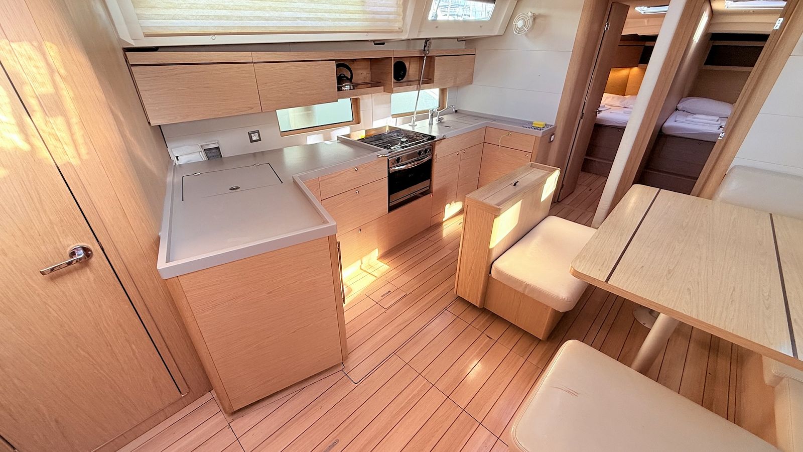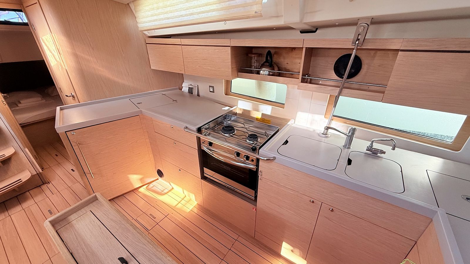 The fully-equipped galley includes cooker, sink and kitchen utensils.
