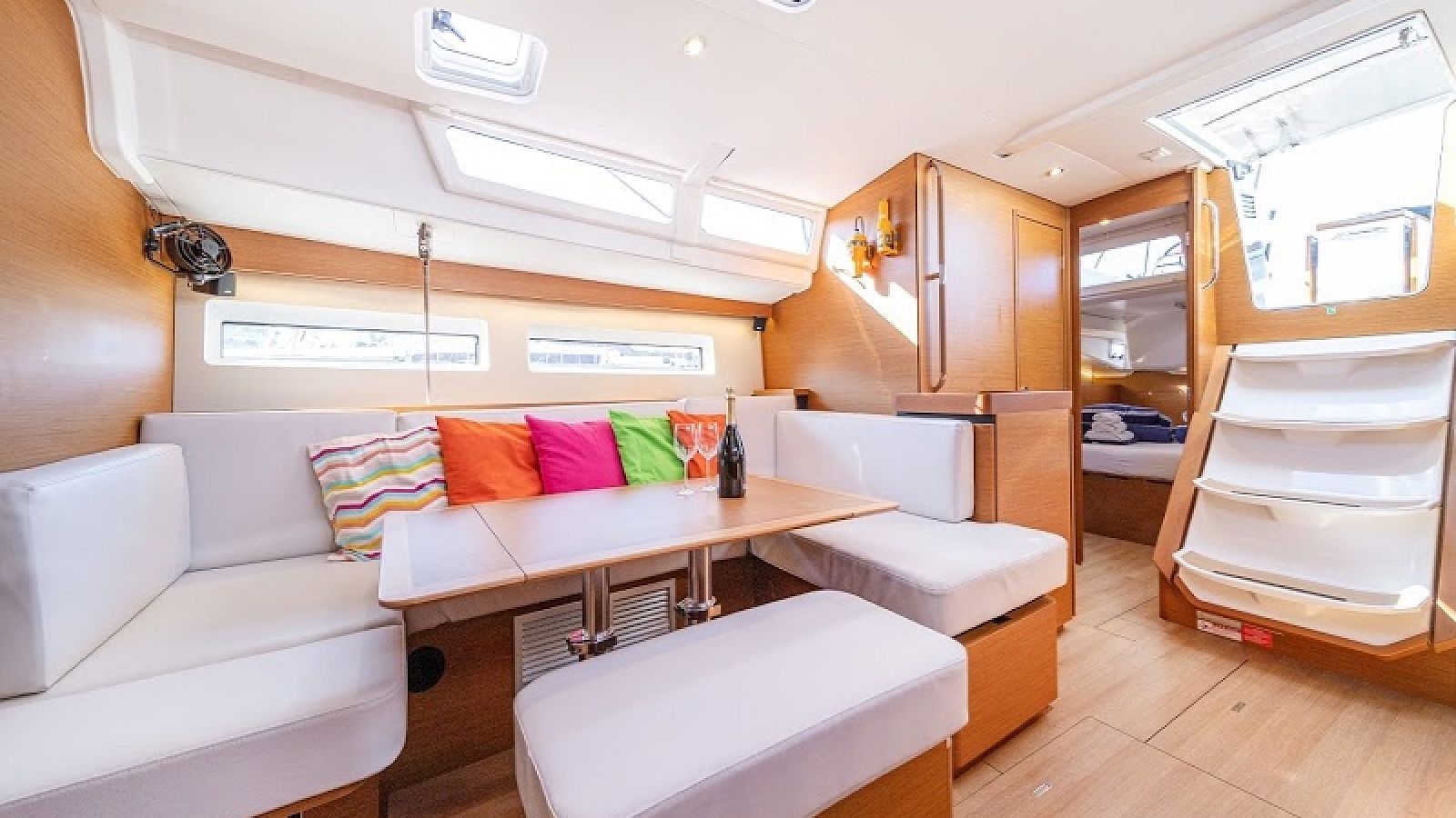 While sailing on DONAR, you can count on safe and easy navigation thanks to autopilot, bow thruster and plotter. Additional convenience and safety equipment includes bimini, teak deck, sprayhood and inverter.